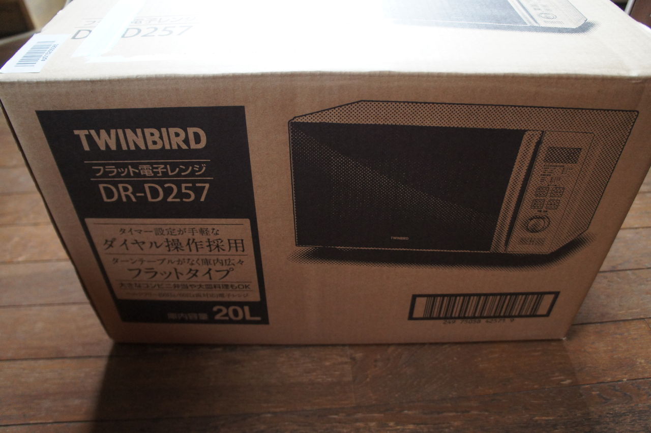 電子レンジ買いました!最近は、オーブンレンジとかスチーム調理みたいな高機能の商品が売れているそうですが、今回、購入したのはオーブン無し。純粋な電子レンジです。楽天とか価格.comなどで調べると、日立のスチームオーブンレンジが1位だったんですが、確かにホームベーカリーで生地を作ってパンを焼いてみたい!みたいな欲求はあったのですが、よくよく考えてみると「本当に、そんなに使うのか?」と自問自答した結果。ツインバードさんの「DR-D257W」を買いました。Amazonさんで8,063円でした。一応、希望として「フラットである事」という条件はありました。コンビニでお弁当を買ってきて、そのまま食べられるというのは良いですからね。