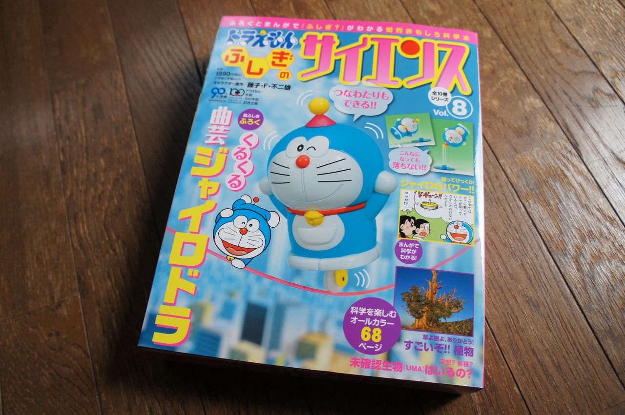 唐突ですが、ドラえもんの科学系雑誌「ドラえもん 不思議のサイエンス」という雑誌に付いてくる付録がすごいです。前からこのシリーズは本屋に並んでいるのを見て気になってましたが、今回の付録はとても興味深くて面白いです。その名も「くるくる曲芸ジャイロドラ」。簡単に説明すると、「地球ゴマ」のような付録なのですが、ジャイロを使って曲芸のような動きをします。