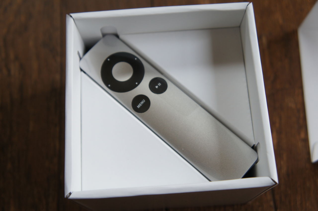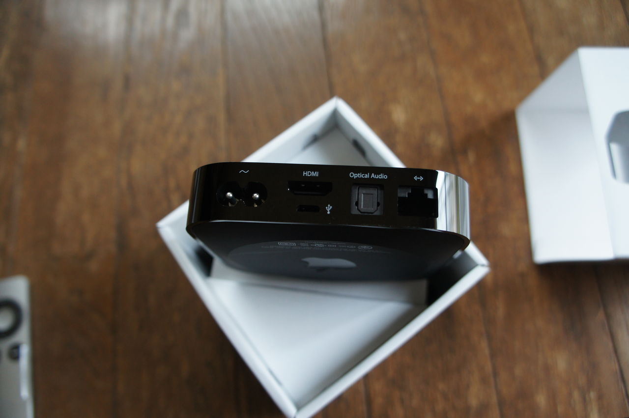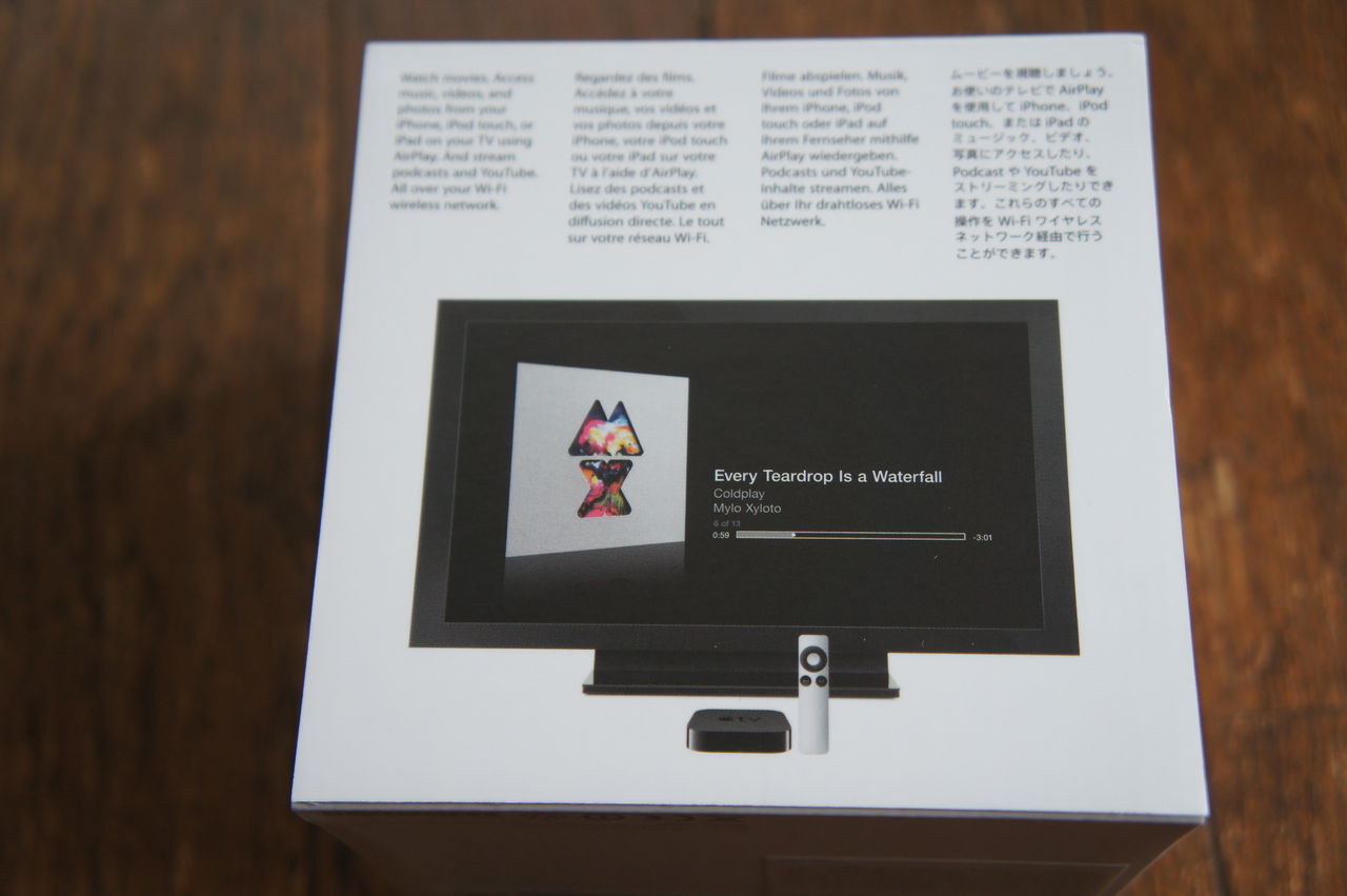 裏はこんな感じです。色々と書かれていますが、「テレビで色々な事がでるきよ」といった事が書かれています。2012年に発売された新型から映像が「1080p」で「HD」に対応したそうです。2013年にも新型が出るか?といった噂もありましたが、実際は中身のマイナーチェンジで、消費電力が下がったそうです。ちなみに、積んでいるチップはアップルの「A5」が搭載されているとの事。