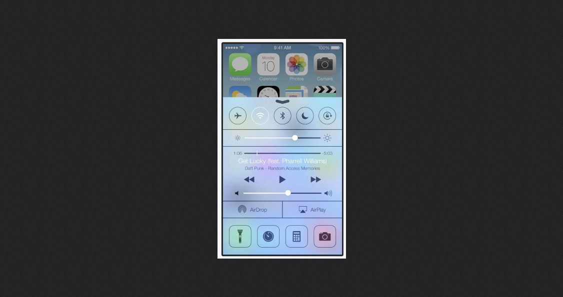 新しいOSをインストールするだけで別のiPhoneになるという触れ込み通り、デザインが一新されています。「Control Center」という機能が付いていて、画面をスワイプする事で音声などの変更を一括でできるという機能。WiFi、Bluetoothなどのオン/オフが可能になっています。