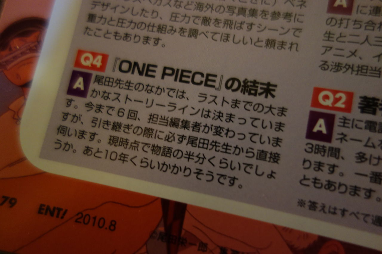で、その秘密を知る唯一の人間が作者である「尾田栄一郎先生」なわけですが、実は他にもこの大秘宝の秘密を知る人物が存在します。日経エンタテインメインによると、それは、連載中の少年ジャンプの編集の担当だそうです。尾田先生は新しい担当が付くたびに、まずONE PIECEの秘密を語るそうです。そう、それは絶対にTwitterで叫んでもいけない。キャバクラでお姉さんにも喋ってはいけない。言ったら速攻でクビになる秘密です。