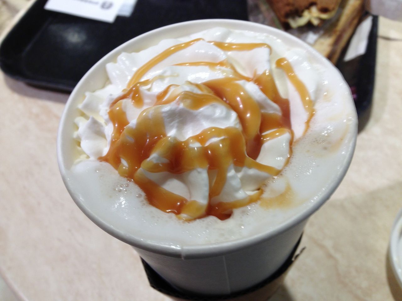 ボクが注文したのは、一番好きなキャラメルマキアートのホットです。普段はトールくらいで抑えておきますが、今回は無料券があったので店員さんに「一番大きいサイズでお願いします」といった注文しました。正確に言うと「ヴェンティ」というサイズだそうです。アメリカだともっと大きいサイズがあるみたいです。で、価格的には500円ちょいなんですが、50円ほど余っていたようで店員さんから「カスタマイズも可能です」と言われたので、店員さんおすすめのホイップクリームを追加で注文しました。