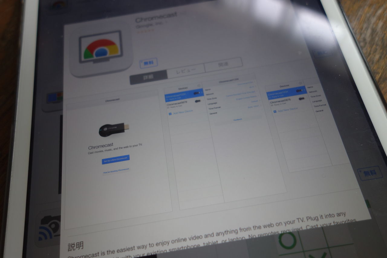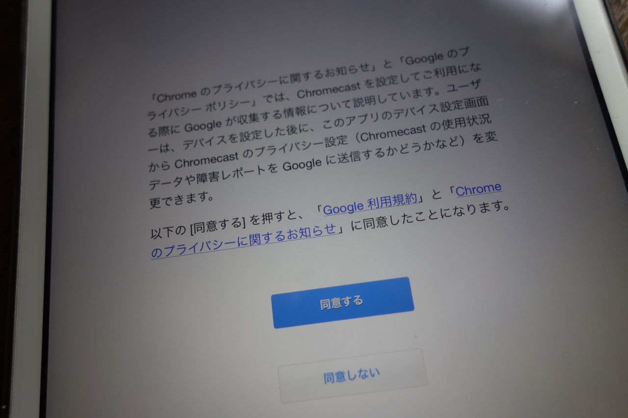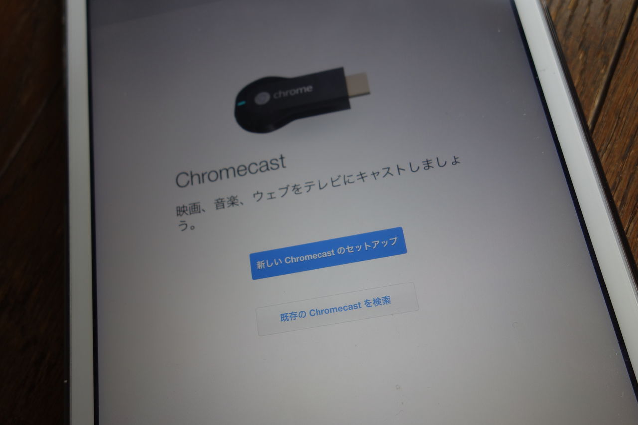 ここからが大事ですが、AppleTVとの大きな違いとして、Chromecast(クロームキャスト)本体だけでは動きません。AppleTVがリモコンを付属してHDMIと電源に接続すれば使えたのに対して、こちにはiPadやAndroid端末が無いと動きません。で、ボクはiPadでセットアップしました。
