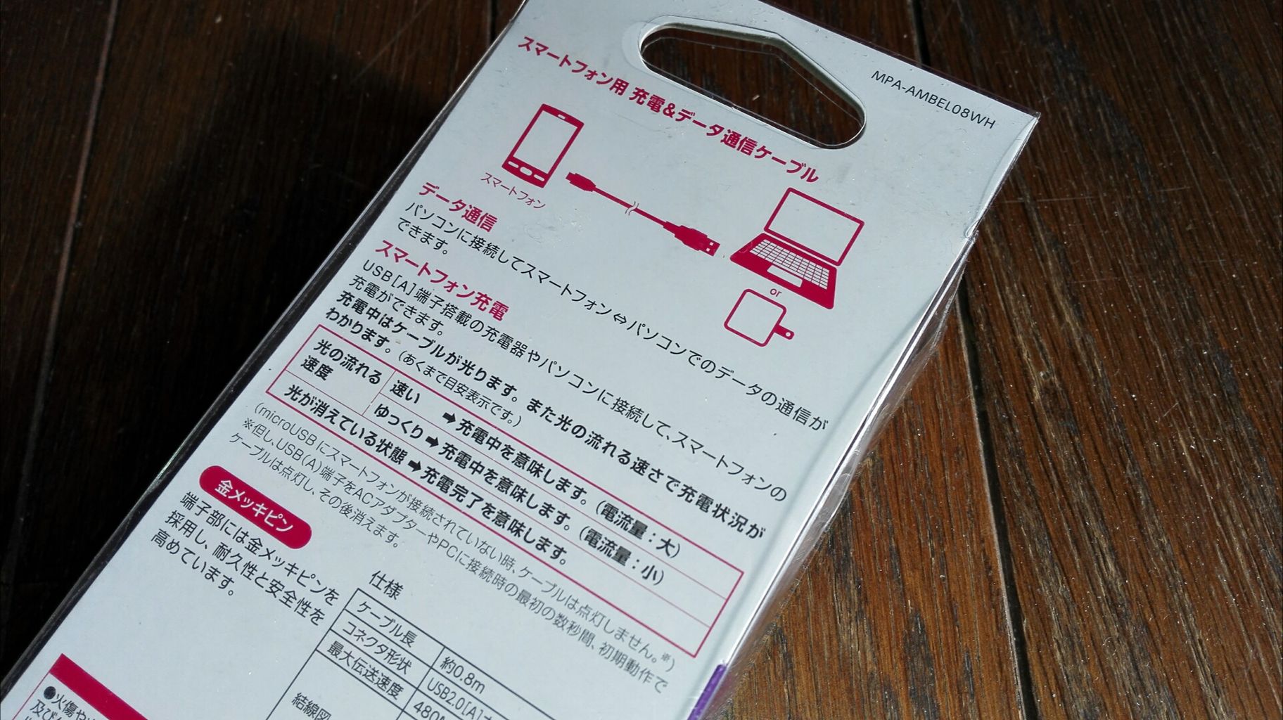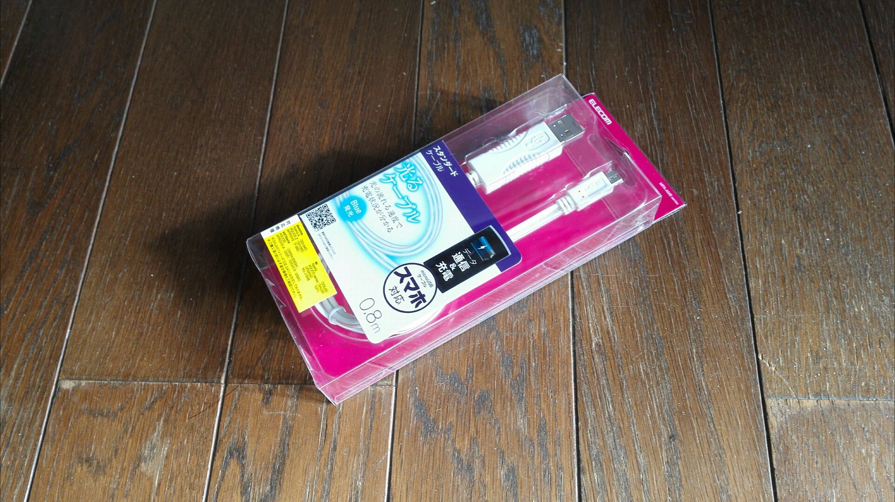 まぁこの辺は普通のUSBケーブルと変わらないですね。光るケーブルは他社からも発売されてますが、やっぱり電気関係は不安なので大手のエレコムさんを選びました。本音を言うと2メートルの物が欲しかったんですが、80cmしかなかったので、これにしました。●パッケージは至って普通。