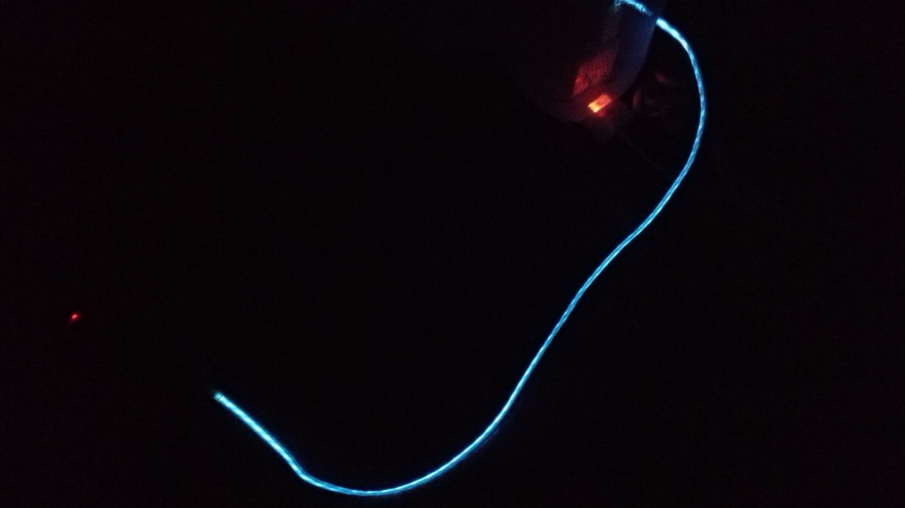 こんな感じで光ります。普通にその流れを見るだけで面白いですっ!写真だとイマイチ伝わりませんが、こんな感じでケーブルが青く光って充電の流れが見えます。やっぱり、これはYouTubeで実際に動画で紹介するのに勝るものはないと思いますが、雰囲気だけは伝わると思います。これで750円で送料込だったら、一度試してみるのも良いかもしれません。