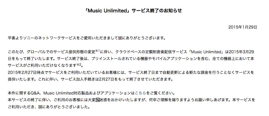 今日、届いたメールを見て結構衝撃を受けました。実はボクがこの「Music Unlimited」の会員でほぼ毎日利用していて、洋楽は殆どこれで聴いているといっても過言ではありませんでした。なんと「Music Unlimited」が2015年の3月29日をもって終了すると発表されました。以下、プレスの引用です。